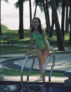 選比基尼時,顏色是最重要的因素。我發現自己在假期開始時很適合淡紫色、青綠色,因為膚色還很蒼白;等曬黑後,熱烈、繽紛的色彩就該上場了。我不喜歡膚色很白的時候穿白色比基尼,但曬黑後白色則成了我的首選。我愛看那樣的人:平時在城市裡只穿黑色和米色,假期的到來,讓她們立刻變成五彩斑斕的花蝴蝶。那些女郎身穿艷粉和橙色時非常燦爛奪目。我曾在印度住過很長一段,那裡婦女穿著的鮮艷顏色讓我精神都會為之振奮。