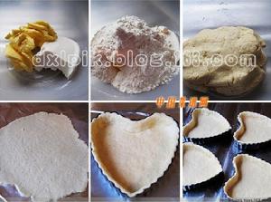 1、黃油和奶油乳酪,室溫下軟化成固成狀態,直至用手指能輕輕搓個孔。2、將麵粉過篩入,用手將三者抓勻到充分融合,揉成淡黃色的麵團。