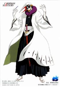 經典打扮是一雙木屐,一頂白綠相間遮住眼睛的帽子,一根手杖,內里藏著他的斬魄刀——紅姬,疑似睡衣的裡衣,套上迎風飄舞的墨綠色袍子,外加一把小小摺扇,很別致的大叔的,怎么看怎么順眼。