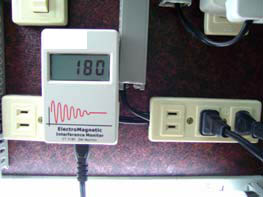 將電磁波檢測儀插入展示板的插座上,此時可讀到檢測儀上的數據:180,表示現在通電狀況下電源線上逸散出的電磁波