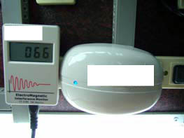 再將消磁器插入插座上,此時消磁器上之指示燈亮起,表示濾波器已經開始作動,可看到檢測儀上的電波數據下降到66,表示消磁器有將部份的電磁波抑減掉,180 → 66, 如下圖所示