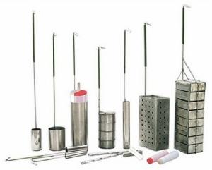液氮罐提籃是由不鏽鋼材質焊接製作而成,使用時要將凍存管放入提籃里,如果是抽屜式提籃,要將凍存管逐一放入抽屜的小子裡,外面的插銷插住抽屜,防止抽屜脫落樣品落出到液氮罐里。將裝好樣品的液氮罐提籃垂直掛在液氮罐口的卡槽上,讓提籃的把手正好掛在卡槽上,樣品槽則完全浸入液氮罐里的液氮里。如需要使用凍存管里的樣品時,將液氮罐提籃提出使用即可。操作時注意不要被液氮凍傷。