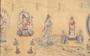 清丁觀鵬法界源流圖卷《法界源流圖卷》是丁觀鵬奉乾隆之命於乾隆三十二年(公元1767年)所畫。他將宋代大理國的描工張勝溫所畫的《梵像圖》摹成兩卷,第一卷名為《蠻王禮佛圖》,第二卷為《法界源流圖卷》。這裡論述的便是第二卷作品中的局部(見圖)。