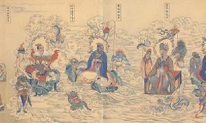 清丁觀鵬法界源流圖卷他身後的佛光照亮了天地萬物,作者巧妙地運用放射性的波紋線條來表現背景,正好與佛光的發射性結合起來。運用這種表現手法正是作者的高明之處,這些線條穿過樹木,透過騰騰的雲氣,一直延展下去,也許正在向世人暗示佛法的無邊。周圍人物各居兩邊,有的為側面,有的為正面;有的呈坐姿,有的呈立姿;有的寬袍長衣,佛帶飄逸,有的袒胸露腹,盔甲滿身;有的面容俊逸,溫和慈善,有的瞠目立眉,叱吒猙獰。表現手法真是多種多樣,但無論怎樣變化,他們都是聚集在佛祖身邊,手拿法器,各居其位,時刻待命。觀此景象也許你會感受到一種無窮的力量在感召著你,那普照的佛光會一直射進你的心中,與你的心靈產生一種完美的契合。