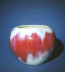 窯變釉是清代雍正時期仿宋代鈞窯而創燒的一種高溫顏色釉。其燒造工藝,據成書於雍正年間的《南窯筆記》載:“其鈞窯及法藍、法翠乃先於窯中燒成無釉澀胎,然後上釉,再入窯復燒乃成。惟藍、翠一火即就,鈞釉則數火乃得流淌各種天然顏色。”此器造型端莊,胎體厚重,釉汁自然流淌,釉色艷麗,配上端莊秀美的器形,極富美感。