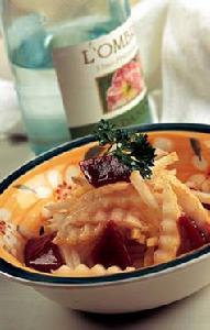 1.將梨洗淨削皮、去籽,切成絲; 2.將山楂糕切成菱形片; 4.將梨絲加鹽、白糖、醋拌勻;