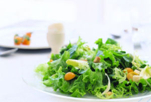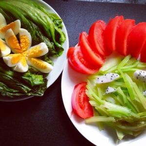 二盤蔬菜:每天應進食兩盤品種多樣的蔬菜,不要常吃一種蔬菜。一天中必須有一盤蔬菜是時令新鮮的、深綠顏色的。最好先食一些大蔥、西紅柿。涼拌芹菜、蘿蔔、嫩萵筍葉等,以免於加熱烹調對維生素A、B1等的破壞。每人每天蔬菜的實際攝入量應保持在400克左右。
