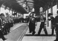 溥儀訪問日本民國二十四年(1935年),已經就任滿洲國“皇帝”的溥儀,在關東軍的安排下,乘坐比睿號戰列艦訪問日本。作為合作的標本,日方為這次訪問下了不少工夫,所到之處,隨處可見揮舞小旗歡迎的日本民眾,表現“日滿和諧”的姿態來。