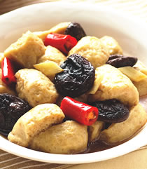 滷汁燒烤麩,原料 烤麩200公克 香菇8朵 薑片15公克 辣椒段15公克 素肉臊滷汁。