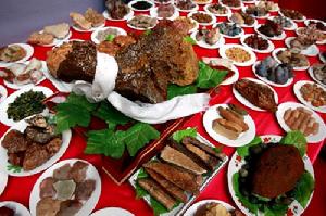 有所謂“32珍”說法。“山八珍”指駝峰、熊掌、猴頭、猩唇、豹胎、犀尾、鹿筋等;“陸八珍”吃什蟆、口蘑、玉皇蘑、鳳抓蘑、玉米珍、沙豐雞、松雞等,“海八珍”為燕窩、魚翅、大烏參、魚肚、魚骨、鮑魚皮等。烹調時要用上蒸、煮、燒、燉、煨、煎、炸、烤、燜、扒、炒、溜的技巧。計有冷葷熱餚196品,點心茶食124品,計肴饌320品佳肴,分3天吃完[來源請求]。