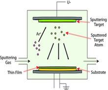 濺射工藝圖如圖1所示,濺射鍍膜最初出現的是簡單的直流二極濺射,它的優點是裝置簡單,但是直流二極濺射沉積速率低;為了保持自持放電,不能在低氣壓( <0.1 Pa)下進行;不能濺射絕緣材料等缺點限制了其套用。在直流二極濺射裝置中增加一個熱陰極和輔助陽極,就構成直流三極濺射。增加的熱陰極和輔助陽極產生的熱電子增強了濺射氣體原子的電離,這樣使濺射即使在低氣壓下也能進行;另外,還可降低濺射電壓,使濺射在低氣壓,低電壓狀態下進行;同時放電電流也增大,並可獨立控制,不受電壓影響。在熱陰極的前面增加一個電極(柵網狀),構成四極濺射裝置,可使放電趨於穩定。但是這些裝置難以獲得濃度較高的電漿區,沉積速度較低,因而未獲得廣泛的工業套用。