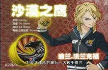 | 迪蘭·法蘭克福【真人版改為“迪蘭”】 (Syria's Deland Frankfurt,縮寫DP) 年齡:15 籍貫:法國 外形:身材高挑,微卷的金髮配上深綠色的眼睛,猶如王子般耀眼的外形。 性別:男 身份:飛鷹隊隊長、銀鷹隊隊長(飛鷹隊以前的隊長,在火力少年王第二部中是銀鷹隊隊長), 世界全能賽負責1A,世界最強1A球手,個人賽世界冠軍。 暱稱:囂張的傢伙(凌亮專用) 配球:曼陀羅、沙漠之鷹、魔劍、銀河劍客 性格:有【巴黎王子】的美譽,對女生極盡紳士風度,十分有修養,臉上總是帶著禮節性的微笑,看起來如陽光般溫暖。不只悠悠球,鋼琴也出神入化,還有一口流利的中文。但內心十分高傲,正是這份高傲,讓他更是人喜愛,捉摸不透。 愛好:悠悠球,小提琴【且造詣頗高】,鋼琴 絕招:鏇轉倒掛、鏇轉倒掛升級版(專門針對姚傑) 擅長:1A-5A 技術:99.5%(世界第一1A球手) 初次登場:第一部第一集 介紹:他是中法混血兒。全劇中除了李非以外實力最強者!其拒絕失敗,認為在賽場只有強弱輸贏,崇尚西方速度打法,並且有自身的風格。從美國回來證明自己“只有西方的悠悠球技術才是真正的悠悠球技術”的理論。他對勝負極其在意,以至於完全沒有玩球的快樂,後由於姚傑與凌亮的影響而回歸正途。他外交手腕了得,深受人的歡迎。迪蘭崇尚自由,對隊員管理較為寬鬆。作為隊長,迪蘭帶領隊伍在困難時沉著應對,以睿智的目光找出解決的辦法。他是一個值得信賴的領袖,姚傑也對他十分欣賞。他與凌亮不同的是他有驕傲的資本!賽場上,有臨機應變的能力,臨危不懼。他能知道別人事先要乾什麼,所有人的優缺點都心知肚明。 成績:凌亮2勝,姚傑2勝(第1勝姚傑手腕發作,第2勝姚傑放棄比賽),何順1勝,松元尚3勝1平,郭睿1勝,山本太郎1勝。(個人賽沒有敗績) | 火力少年王3[2010年由岳峰執導的卡通片] |