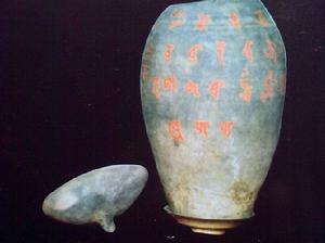 彝族火葬罐高約1米,材料為土陶,直徑約30-50厘米,上下窄中間寬,罐子外面紋有象徵宗教寓意的彝族文字。