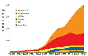 有別於其他歐洲國家,烏克蘭的DIY連鎖超市在這前後12年中是由三家本土企業所主導,他們在烏克蘭全分部建材家居市場中占了25,7%的份額,並且積累了進一步邁向國際市場的能力。而上圖所列出的6家在烏克蘭DIY連鎖超市在烏克蘭建材家居市場中所占的份額是27,9%(所有DIY超市的份額中上述6家占了87,4%的比例。)