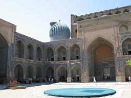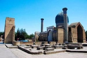 古爾-艾米爾陵墓古爾-艾米爾陵墓位於撒馬爾罕市區內,是帖木兒及其後嗣的陵墓,建於15世紀。陵墓造型壯觀,色彩鮮艷,有球錐形大圓頂,具有濃厚的東方伊斯蘭建築特色,是世界著名的中亞建築瑰寶。陵墓始建於1403年,最初作為猝死的帖木兒之孫穆罕默德·蘇爾丹之墓,後成為帖木兒家族墓。陵墓的墓室中有9個長方形的墓冢。陵墓中分別安葬著帖木兒、帖木兒的兩個兒子、兩個孫子(其中一個是兀魯伯)、兀魯伯的兩個兒子、兀魯伯的宗教老師以及一個未查明姓氏者。這裡最為引人注目的是帖木兒之孫兀魯伯為帖木兒建的墨綠色玉石墓冢。帖木兒墓上寫著:誰掘我的墓,誰就遭殃。1941年6月8日曾有人挖掘了帖木兒的墓,兩周后希特勒就開始入侵蘇聯。不過,那一次對墓葬的發掘證實了關於帖木兒面部特徵的歷史記載,證實了兀魯伯死於暴力殺害的傳說,以及所葬其它帖木兒家族成員身份的真實性。