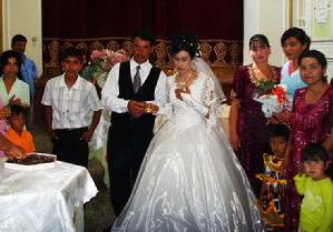 婚禮烏茲別克人婚姻關係宗教色彩較濃,規定男女雙方都是信奉伊蘭教的信徒。不能與其他民族、宗教的人有婚姻關係。他們的習慣是在親戚之間通婚,如姑表、姨表、堂兄妹之間均可結成婚姻關係。親事一般都是包辦性質,先由男方父母規定對象。再請媒人正式提親。然後舉行訂婚儀式。商定彩禮及其他婚典費用、一切都決定好之後再給媒人送禮。以示感謝。傳統婚禮要舉行四天,第一天到女方家慶賀,費用由男方支付,晚上二阿訇誦瀆《古蘭經》,新娘打扮好以後,由女親戚陪伴去婆家。第二天在男方家慶賀。慶賀次序是:第一天在女方家以女客為主,第二天在男方家以男客為主。特別是第二天晚上要揭面紗,由新娘家的女性親戚進,一旦新娘的真面目顯露於廣眾面前,歡樂的氣氛達到了高潮。第三天,由新娘的父母招待客人,以示慶賀和感謝。第四天,由新郎父母款待賓客,贈送禮品,以示婚禮告罄。