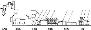 主要由高速混合機、擠出機、壓延機和牽引機、捲曲機組組等組成。參見上圖