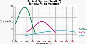 熱電材料的製備方法通常是熔體定向晶化法或者粉末壓製成型法。每種製備方法都具有各自的優勢,定向生長的方法更為普遍。除了碲化鉍之外,另外還有包括碲化鉛,矽鍺合金,鉍銻合金等體系分別套用在不同的條件下。圖2.1是不同材料的熱電優值係數隨溫度變化的曲線。