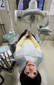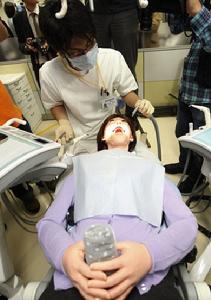 2010年3月25日,在日本東京昭和大學,一名牙醫正在對新型牙科訓練機器人(下)進行“治療”。