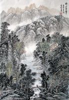 秋色滿山 牟克民 68x136cm除盧老以上的評價之外,牟克民先生的畫作還有著鮮民的個人藝術特色。雖然他對大自然的描繪表現技法極為豐富,但他最為擅長的還是點皴(cūn)法、線皴法。即以點積線,以線積面,以求達到一種非同尋常的藝術效果。這是他不同於江蘇山水畫家以渲染手法來描寫山水畫的一個很大區別。此法雖取自黃賓虹,卻與其又有不同,他在傳統的基礎上加以創新,他用他自己的法度,使筆墨更蒼渾厚重,意境幽深。比如,他的《長白雪霽》,圖中泉由山深處運化曲折而出,似連仍斷,斷而連,氣脈貫通,並以亂石夾水,活潑而下,出如有門。不僅如此,讓觀者感到更妙的是,滿山的白雪看著活潑而下的山泉,無不蠢蠢欲動,恨不能立即化為山泉,一瀉千里。