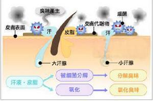 由於細菌與大汗腺的分泌物發生作用產生不飽和脂肪酸導致特殊臭味的形成,細菌為原核微生物的一類,是一類形狀細短,結構簡單的原核生物。