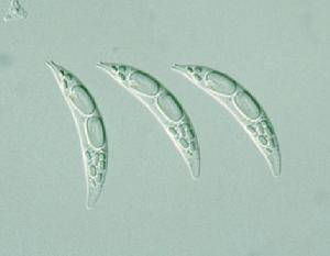 細胞呈玄月狀彎曲,背凸腹凹,有時腹線的中段較平直,前端呈頸狀,具2片刺形或圓形的唇形突起,後端漸窄,呈鈍圓形或尖圓形。表質具縱紋。副澱粉粒多數,常具1~3個呈桿狀的大顆粒,此外還有一些桿形或橢圓形的小顆粒。鞭毛長為體長的1/3~1/2。核中位略偏後。細胞長43~60微米,寬8~12微米,厚5~8微米。