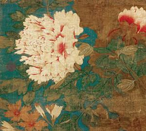 《玉堂富貴圖》局部 該畫面下部畫的是一片假山石伏在花叢下面,顯得十分沉著、穩定,假山中臥著一隻色彩斑斕而不俗艷的雉雞。雉雞的大半個身子露出石外。正仰頭望著頭上的一束野花。雉雞羽毛質感鮮明,姿態恬淡悠閒。象徵著富貴的幾朵牡丹怒放在畫面正中部,很引人注目。牡丹花朵碩大,其中一朵顯得更加艷麗,另有幾朵含苞待放,其雍榮之姿顯然。牡丹上面是幽香的玉蘭、鮮艷的杜鵑和妍麗的海棠,在繁茂的枝葉映襯下,花朵星羅棋布,使畫面更加富於生機。同時這些小小的花朵與牡丹形成鮮明的對比,使牡丹顯得愈發嬌艷,華貴。枝葉間還點綴幾隻嬉戲的小鳥,雖很逼真,但同雉雞的畫法一樣,略顯呆板,帶有早期花鳥畫的特點。