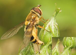 (2)腐食性:以腐敗的有機物為食。如管蚜蠅屬Eristalis、斑眼蚜蠅屬Eristalinus、粗股蚜蠅屬Syritta、蜂蚜蠅屬Volucella的幼蟲。