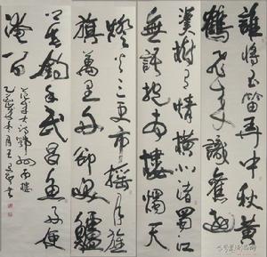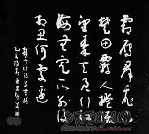 王友智教授的狂草是充分性情化的,那種訴諸視覺的強烈的節奏和鏇律感,傳達出的是一種“紙上颼颼風雨聲,行間屹屹龍蛇動”的韻律感,其線條的敏感多變和搖曳多姿顯示出書家精神觸覺的豐富和跳躍。它充分展示出作者對傳統書道的暢達以及對創新意境的敞顯。