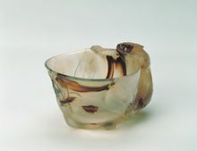 明瑪瑙單螭耳杯傳說愛和美的女神阿佛洛狄,躺在樹蔭下熟睡時,她的兒子愛神厄洛斯,偷偷的把她閃閃發光的指甲剪下來,並歡天喜地拿著指甲飛上了天空。飛到空中的厄洛斯,一不小心把指甲弄掉了,而掉落到地上的指甲變成了石頭,就是瑪瑙。因此有人認為擁有瑪瑙,可以強化愛情,調整自己與愛人之間的感情。在日本的神話中,玉祖櫛明玉命獻給天照大神的,就是一塊月牙形的綠瑪瑙,這也是日本三種神器之一。《太平廣記》中亦有“瑪瑙,鬼血所化也。”給瑪瑙增添了幾分奇詭之色。