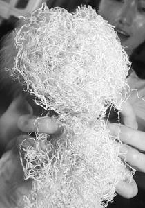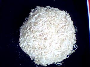 國內的鋼絲球原料屬於一種改拔絲,最初就是鋼筋,和我們農村蓋民房時用的盤圓鋼筋差不多,當然建築用鋼筋是不能改的。這種專用鋼筋經過第一次改拔後,變成線徑0.70-0.75毫米的如同原子筆芯粗細的鋼絲清潔球原料,這個過程俗稱大拔。鋅層就是在這個過程中鍍上的,有高鋅層(熱鍍工藝)和低鋅層(冷鍍工藝)。把70料再次改拔,就變成線徑0.13毫米的如同頭髮絲粗細的鋼絲清潔球原料,這時的絲均勻的纏繞線上軸上,俗稱13絲。13絲的質量主要取決於排線的質量,也就是13絲必須絲毫不差的緻密的一匝一匝的纏繞線上軸上。這么細的絲兒,有的清潔球機械竟然吹牛說不斷絲,呵呵,從理論上都沒有這種可能。製作的材料