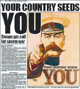英國征精廣告 英國法律2005年規定採用“實名制”捐精後,英國捐精者數量急劇減少,導致英國精子庫的庫存嚴重短缺,使許多絕望的不孕夫婦求治無門。令人驚訝的是,拯救全國“精子危機”這一艱巨任務,最終竟落在了英軍大兵身上。英國各大生育診所紛紛向英軍部隊發出“征精廣告”,以緩解燃眉之急。而廣告詞正是第一次世界大戰期間家喻戶曉的徵兵宣傳口號——“你的國家需要你!” 生物學子女