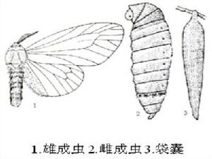 成蟲:雌蟲長約9mm,淡黃色。雄蟲長8~11mm,前後翅透明,體灰褐色,具白色鱗毛。 幼蟲:體長25~30mm,紅褐色,胸部背面有深色點紋,腹部毛片色深。 袋囊:長約30mm,完全用絲織成,灰白色,袋囊絲質較密緻,不附葉片與枝梗。 長江流域1年1代,個別種或在南方有1年2代的,以老熟幼蟲在袋囊內越冬。翌年春天一般不再活動、取食,或稍微活動取食,桉袋蛾需繼續活動為害。白囊袋蛾,1世代,蛹期6月—7月上旬,成蟲期6月下旬—7月中旬,卵期7月中旬,幼蟲期7月中旬—翌年5月下旬。