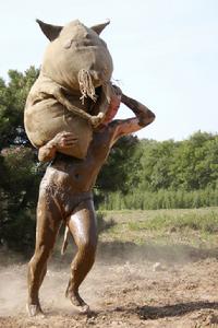 材料:裝糧食的麻袋(碩鼠造型)、75公斤玉米