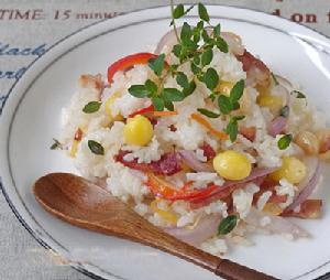 隔夜米飯一大碗,白果仁50克,培根肉3片,洋蔥半個,胡蘿蔔適量,紅椒絲適量,百里香一小把