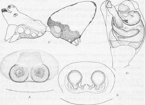 體長2.64。頭胸部長1.35;腹部長1.06,高1.72。眼域突起,呈丘狀;額部向前上方突出,頂部有一圈細毛;兩突起之間呈一橫溝。其他特徵同雌蛛。觸肢器的根部為一突出的長骨片,頂端下折呈三角形。生物學描述