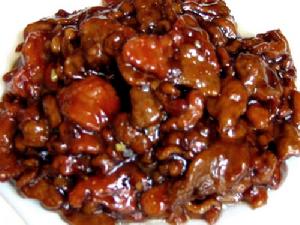11. 調入味素,淋入水澱粉勾成玻璃芡,淋入雞油,澆在羊肉上即成。