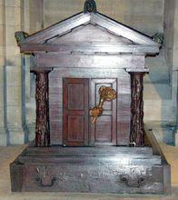 盧梭一切思想的理論基礎是他的自然法則理論。為師法自然,他的棺木外形也設計成為鄉村小寺廟模樣。從正面看,廟門微微開啟,從門縫裡伸出一隻手來,手中擎著一支熊熊燃燒的火炬,象徵著盧梭的思想點燃了革命的燎原烈火 。
