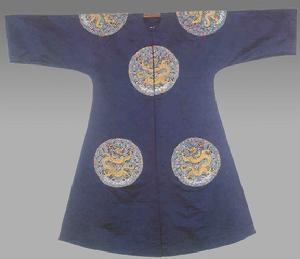 信息 名稱:清石青緞團龍袍 . 類別:織繡 年代:清... 收藏:南京博物院 文物鑑賞: 清石青緞團龍袍的形式為圓領、對襟、闊袖直身褂,以石青色素緞作面料,在袍的前胸、後背及兩肩用金線共繡八條團...