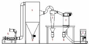 該氣流粉碎分級機的粉碎機理決定了其適用範圍廣、成品細度高等特點,典型的物料有:超硬的金剛石、碳化矽、金屬粉末等,高純要求的:陶瓷色料、醫藥、生化等,低溫要求的:醫藥、PVC。通過將氣源部份的普通空氣變更為氮氣、二氧化碳氣等惰性氣體,可使本機成為惰性氣體保護設備,適用於易燃易爆、易氧化等物料的粉碎分級加工。工藝流程圖