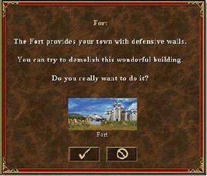 現在城鎮可以被毀然後重建要摧毀城鎮裡的某個建築,必須要在你打算摧毀的那個建築上按右鍵。你必須要使用一個訪問該城鎮的英雄來摧毀建築,呆在城鎮內的英雄則不可以。