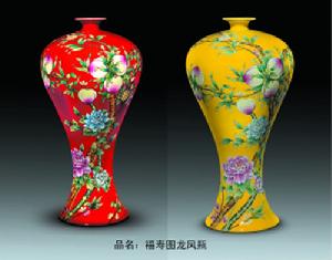 琺瑯彩“龍鳳美人瓶”圖案源自慈禧太后五十大壽親筆繪製的《福壽圖》,原稿現在藏於故宮。瓶體上繪製桃樹一株,壽桃九顆,象徵長長久久;配有蝙蝠紋飾,象徵福壽無疆,富貴天長;瓶身下部有牡丹圖樣,象徵花開富貴,盛世圓滿。瓶體形狀以美人肩、腰為園型,肩部圓潤光滑,腰部纖細柔美,既是和諧完美的象徵,又是對女性的尊重,整件作品富有感情和人文氣息。