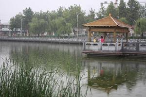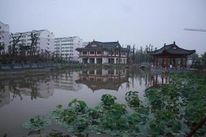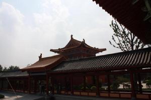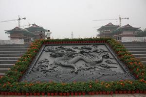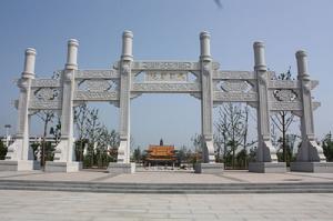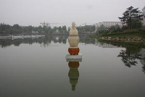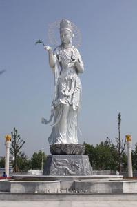 “菩薩廣場”即“禮佛大道”北區空間,約5.4萬平方米。以偏北部取半園形(108*130m),設三大同心圓,南部附設三級緩步台階(適應地勢),由外向內、由南向北逐漸升高。內圓空間,地面飾蓮花,中心塑造“持蓮花菩薩”像,鈦金(或不鏽鋼)材質,色銀白,高19米;外部空間為“蓮池噴泉”,池底著天藍色,飾銀色蓮花若干;外圓空間較寬大,左右側弧形排列“阿育王柱”各四根,象徵“八正道”。石質,高9米;外圓台下四等級象徵“四聖諦”;南部空間左右各三大殿,主殿分別是“大觀樓”和“梵音閣”,為佛教藝術展與會議演出廳;北側左右各植大樹六棵,象徵“十二因緣”;南側廣場約1萬平方米,上有高台兩層,下部空間用於舉行法會或大型(文化節)活動觀眾座席。