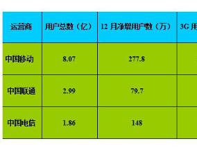 三大運營商陸續公布了2014年12月的運營數據。數據來看,中國移動2014年12月總用戶數達8.07億、淨增用戶數量達到277.8萬,位列三大運營商之首。