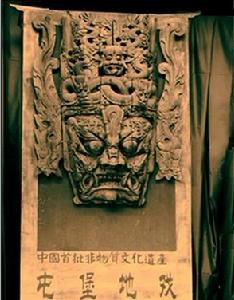 頭戴面具是地戲演出的重要特徵。關於面具的發展,在中國已有幾千年的歷史,它是中國儺文化發展軌跡上不可忽視的一個光點。面具在古代先民的社會生活中有著非常重要的功能作用。它掩容增威的威懾功能,溝通了人神之間的距離,在崇尚圖騰畏懼大自然風雨雷電不可知的摧毀力的古代先民心目中,是他們對生的希冀和對死的恐懼的膜拜物。 地戲面具俗稱“臉子”。是用丁木和楊木刻制而成。用此兩種木料,一是取材容易,二是木質細疤結少,便於用刀。隨著人口激增山林減少,且獨具特色飽熏民俗特徵的面具隨旅遊發展而成為人們喜愛的工藝品,大量用材的需要,工匠們更青睞易生易長的白楊。 一堂地戲面具的多少視劇中人物而定。少則幾十面,多則上百面。演出內容的單一化──只有金戈鐵馬的征戰故事,使人物角色的分類主要以"將"為主。粗分可為“正將”和“反將”(或稱“番將”)。由於地戲是漢文化的一部分,在漢民族正統思想的支配下,總以漢人當政一方為正方,稱“正將”以番邦為反方,稱“反將”。 面具的用色比較講究人物的性格特徵。按雕刻藝人的話說“要跟書走”,書中對人物的描述是什麼性格,就要用藝人們心目中性格化的顏色來表示。以單色論,一般紅色代表忠勇(如薛仁貴),黑色代表剛烈(如張飛),藍色代表果敢(如單雄信),綠色代表穩沉(如尉遲寶林),白色代表英武(如馬超)。另外,書中對人物臉相的描述是什麼顏色,或者內涵情節因素,用色上也必須“跟書走”。如臉若重棗的關羽用紅色,性如烈火的黑炭頭尉遲恭用黑色,臉似金妝的余化是金,,因與尉遲恭爭當征東元帥舉石獅累得吐血而病倒的秦叔寶,自然就要用黃色代表了。若單色加上對稱的花紋,那就是反將了。 地戲,作為一種古老的民間戲劇,在其戲劇本體中就包含著諸多的祭祀因子。當劇中人物被罩上“神”的光暈後,崇尚多神信奉的屯堡人在把地戲看作娛人娛己的藝術樣式時,更把劇中人物賦予神性而視為自身命運的主宰者。稼禾的豐歉、村寨的平安、人畜的興旺等既靠科學技術,也依賴神靈的保佑。如此,祈福納吉的祭祀儀式就自然構成地戲演出中的一部分了。