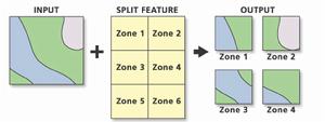 空間析取分析(split)是地理學名詞,GIS軟體中常用操作之一,析取分析(split)輸入要素會創建由多個輸出要素類構成的子集。