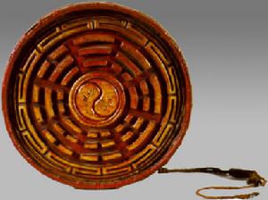 清歙縣竹編木刻八卦盤辟邪掛件面為木製,上刻太極八卦圖案,底及邊為竹篾編制,底系有繩子用以懸掛。舊時多懸掛於民居的門額,用於驅災除禍,為避邪之物。