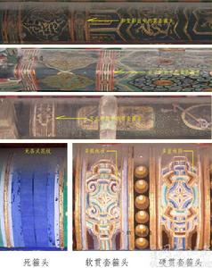 貫套箍頭最早被運用於古代官式建築彩畫之上的確切年代目前無法妄斷,但從現存遺蹟上觀察,其主要的盛行階段為清代中期的乾隆、嘉慶兩朝,至於是否起始於更早,很難判斷,到了清代晚期,基本上被“福、壽”等吉祥寓意的紋飾所取代,已經不再運用了。貫套箍頭的紋飾本身出現的相對較早,在明代的造像服飾中已可見到,如東嶽廟育德殿內的明代塑像,僅是運用在建築彩畫上相對略晚而已。