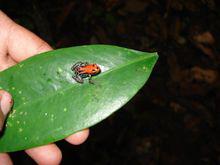 3.斑背毒蛙這種醒目紅色或橙色皮膚的對潛在的捕食者而言是個危險的信號。這種蛙生活在南美亞馬遜河盆地南部雨林地面的落葉堆上。
