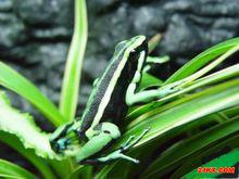 雨林箭毒蛙飼養箭毒蛙的環境以潮濕的環境為主,缸壁最好貼上吸水的材料如樹皮,棕梠纖維或蛇木片等,上面再種上鳳梨科植物,地面上布置小水窪和落葉或棕梠纖維,並種上植物,濕度保持80-100%,最好裝設自動噴霧器,早晚噴霧一次,溫度保持24-30度間,夜間可以降低3度左右以產生溫差,由於箭毒蛙也常分布在地勢較高的山丘地帶,所以不適合高於30度的高溫,在台灣夏天必須注意通風與降溫。值得注意的是箭毒蛙並不適於群養,如果多隻成體同養在狹小的空間中,雌蛙會互相打鬥致死,特別是有雄蛙在場時。初學者最好單獨飼養或成對飼養。如果是幼蛙就比較沒有這種問題。由於箭毒蛙的腳趾上有吸盤,所以很善於攀爬,雖不至於爬上玻璃表面,但是粗糙表面都可以輕易爬上去,所以飼養缸必須加蓋以防止脫逃。